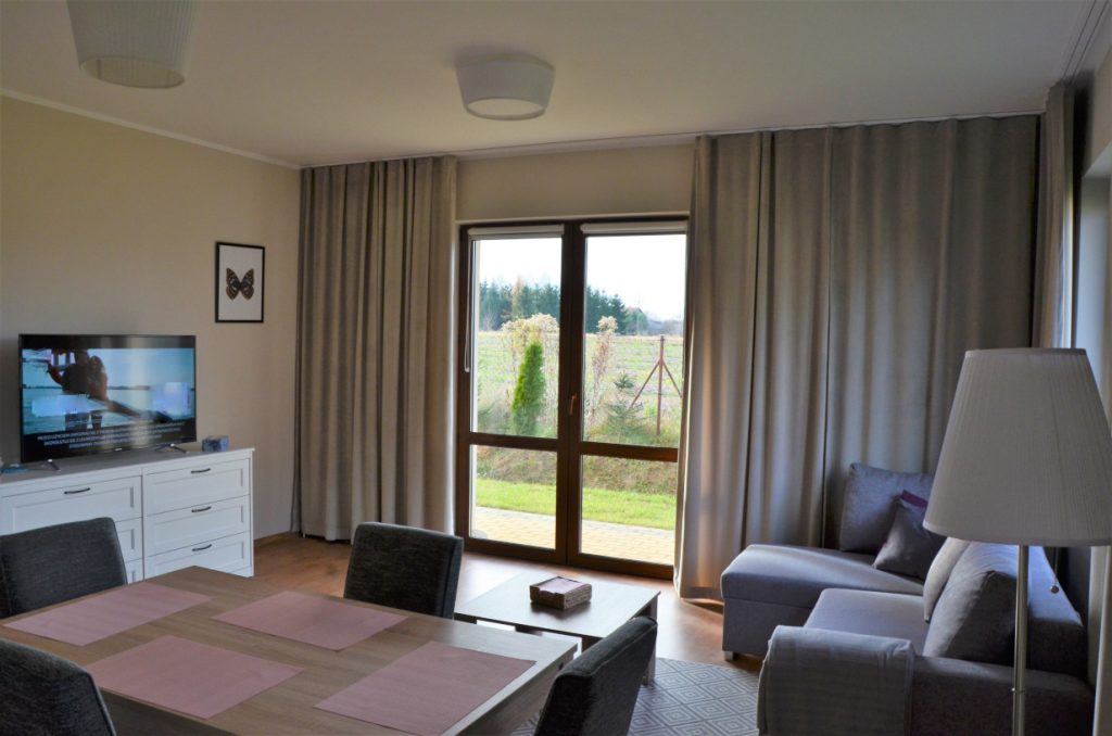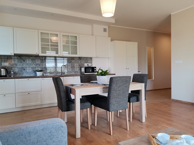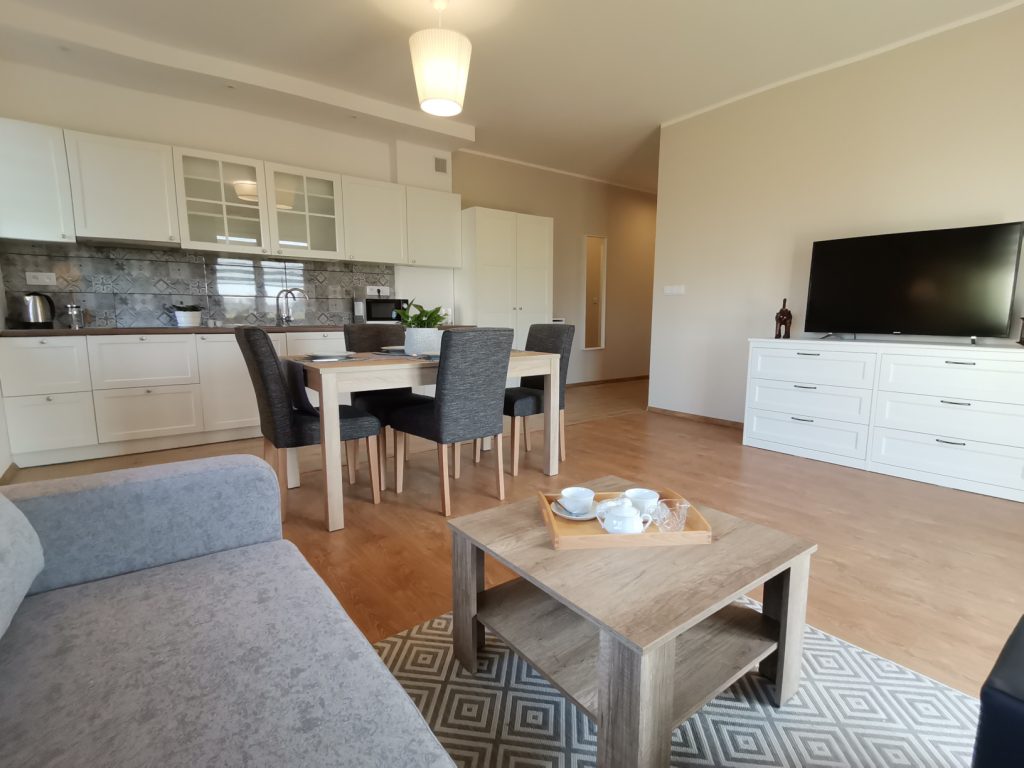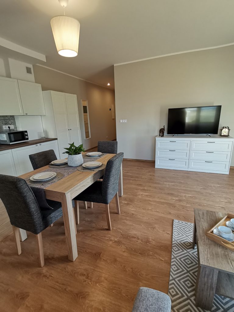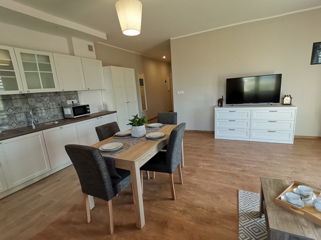 Apartament o powierzchni 48 metrów usytuowany na parterze z wyjściem na taras na trawie (salon z aneksem kuchennym, sypialnią i łazienką) zapewnia odpoczynek w komfortowych warunkach. Aneks kuchenny w pełni wyposażony ( garnki, zastawa stołowa, ekspres do kawy i kawa ziarnista, czajnik elektryczny, pralka, kuchenka mikrofalowa), oprócz tego na wyposażeniu mieszkania znajdują się deska do prasowania, żelazko, suszarka do włosów, leżaki, telewizor w salonie i sypialni i szybki internet.