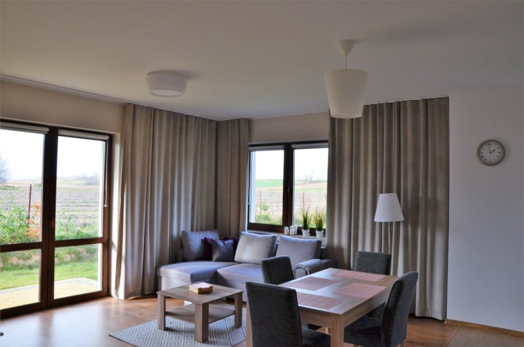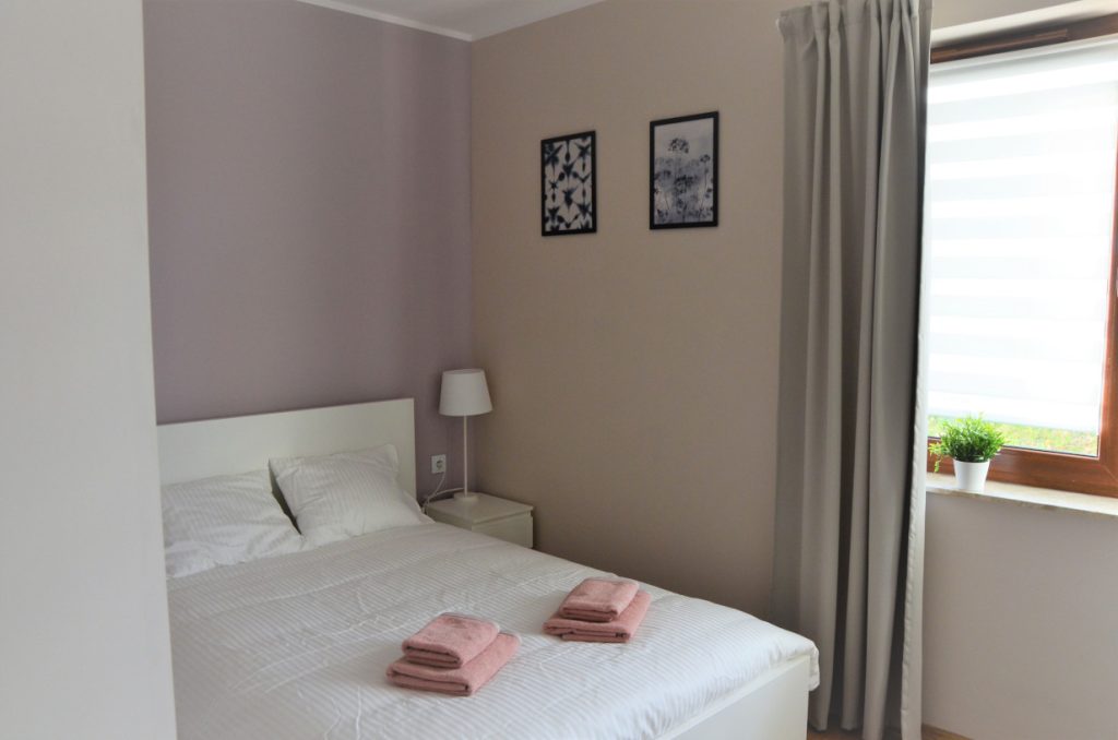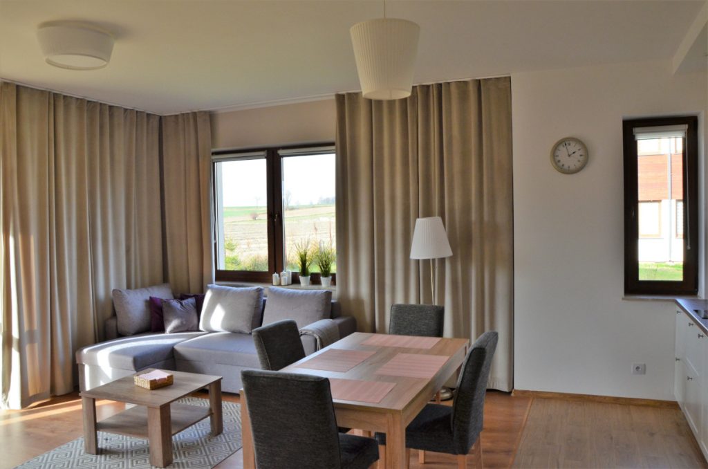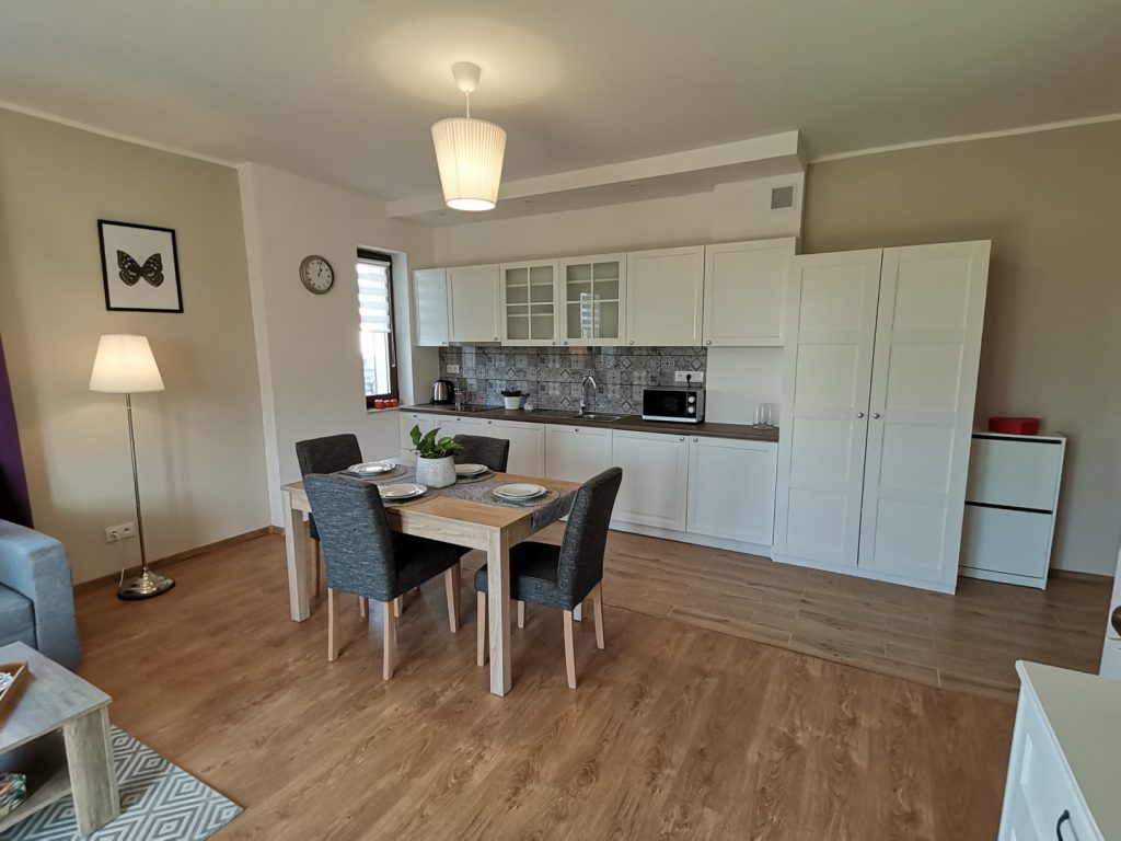 Apartament o powierzchni 48 metrów usytuowany na parterze z wyjściem na taras na trawie (salon z aneksem kuchennym, sypialnią i łazienką) zapewnia odpoczynek w komfortowych warunkach. Aneks kuchenny w pełni wyposażony ( garnki, zastawa stołowa, ekspres do kawy i kawa ziarnista, czajnik elektryczny, pralka, kuchenka mikrofalowa), oprócz tego na wyposażeniu mieszkania znajdują się deska do prasowania, żelazko, suszarka do włosów, leżaki, telewizor w salonie i sypialni i szybki internet.